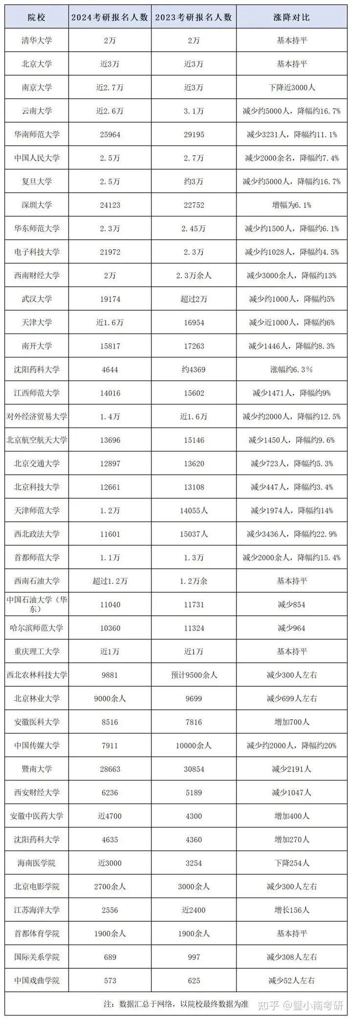 從目前各院校公布的數據來看,大部分院校的報考人數較23考研有所下降。其中,985、211院校考研人數普遍下降,但是基數還是大;部分雙非院校考研熱度不容小覷,報考人數較多。