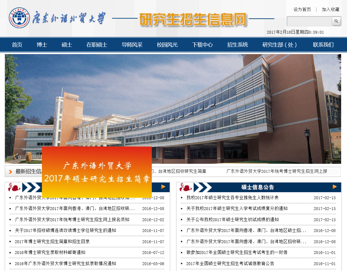正文摘要:本帖最后由 切里。小團子 于 2017-2-16 09:01 編輯 搬運一下~ 首先是廣外研究生招生信息網(wǎng),所有的官方通知,包括招生目錄、簡章、參考教材、推免人數(shù)、成績查詢、錄取通知等等都是在這個網(wǎng)址,所有消息以此官網(wǎng) ... |
